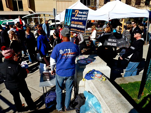 People gave the "witch" a wide berth. It was a Farmers' Market day, so the Capitol Square was pretty crowded, mostly with people who didn't seem to be shopping for any new political ideas. But there was a woman standing under a black "Recall Walker" umbrella, and a man with a lot of 9/11 Truther paraphernalia.